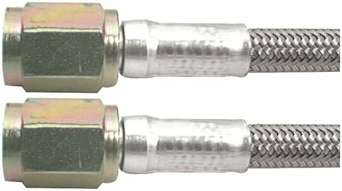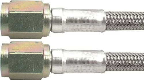 A wide selection of braided steel lines in various lengths. All lines come with one straight end and your choice of straight, 45° or 90° on the other end. The inner PTFE hose is compatible with all brake fluids. The braided stainless steel outer covering resists abrasion and corrosion. Ideal for use where bending and flexing occur. More durable than rubber hose. Lengths stated are overall end to end including fittings.