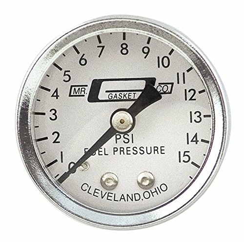 Mr. Gasket Fuel Pressure Gauges accurately, reliably monitor pressure and empower you to easily make changes with an adjustable fuel-pressure regulator. These 1.5-inch mechanical analog gauges read in 1/2-pound increments across a range from 0 to 15 pounds, fit almost anywhere, are compatible with any 1/8-inch NPT female port, and feature a 270-degree sweep, an easy-to-read white face with black numbers, and a chrome bezel.