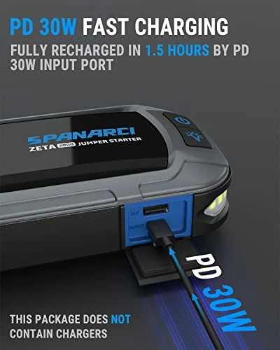 - Quick Charge – The Spanarci jump pack is equipped with a PD 30W Type-C input port. If you uses a 30W charger to charge the ZETA 2000 jump starter, which can be quickly charge up to 100% in 1.5 hours. And standby 24 months after it is fully charged. 【Note】The device is not equipped with a charger and can be charged with any type of mobile phone charger.
