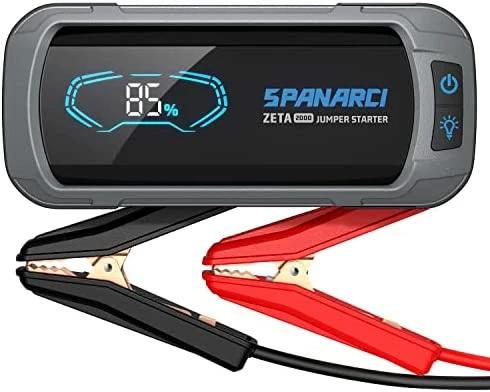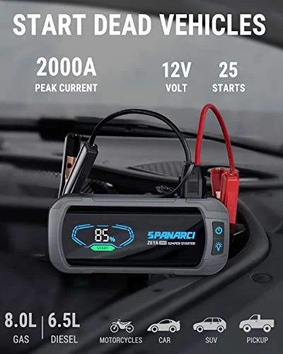 - Powerful Jumping Performance – 2000 Amp peak current Spanarci battery jump starters can quickly start up to 6.5L diesel and 8.0L gasoline vehicles in seconds. up to 25 times on a single charge. Even if the battery is completely dead, you can press the power button and the light button (BOOST FUNCTION) at the same time for 3s to activate the battery. It is suitable for most devices and vehicles equipped with 12V batteries.