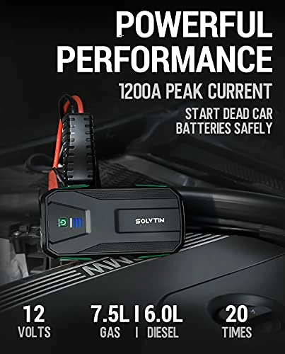 - Powerful Performance: With 1200A peak current, SOLVTIN S6 jump starter can start the car with up to 7.5L Gas & 6.0L diesel engines about 20 times in a single charge. Suitable for most 12V passenger cars.