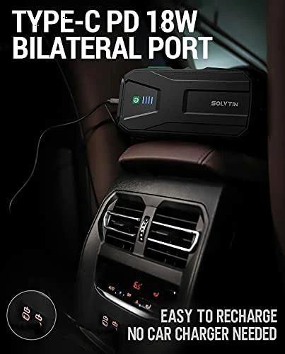 - Upgraded Quick Charger: SOLVTIN S6 jump pack is equipped with a PD 18W bilateral port which can fit the USB-C to C & USB-C to Lightning perfectly. It can also be charged with the USB-C output on your car easily. Wall charger is NOT included for eco-friendliness.