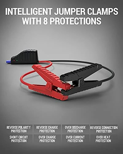 - Intelligent Secure Protection: The jumper cables, coming with the SOLVTIN S6 jump box, has a smart protector with 8 protection systems. The red/green indicator will show the status if the device ensures the safety during jumping. Heavy duty jumper clamps are durable enough for repetitive use.